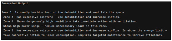 Figure 3 shows the output generated by the GPT-2-Medium model, which provides targeted, zone-specific recommendations primarily focused on humidity control. While GPT-2-Medium balances simplicity and practicality, its outputs tend to follow repetitive phrasings and show limited ability to generate novel or varied sentence structures compared to larger models. Notably, in this example, the model failed to detect and address the high energy consumption observed in Zone 5, underscoring its difficulty in capturing multiple simultaneous operational issues.