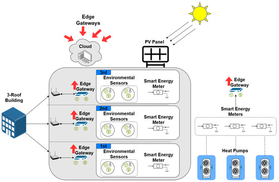 To demonstrate the real-world applicability of the proposed recommendation engine, a deployment scenario is presented based on a pilot smart building environment currently used for system evaluation. The building illustrated in Figure 6 is a 500 m2 three-story mixed-use facility located in Thessaloniki, Greece, combining residential and commercial functions. It is equipped with rooftop photovoltaic (PV) panels, one heat pump per floor, and a comprehensive IoT infrastructure. Each floor operates as a distinct thermal zone, resulting in three total zones: Ground Floor (Zone 1), First Floor (Zone 2), and Second Floor (Zone 3).