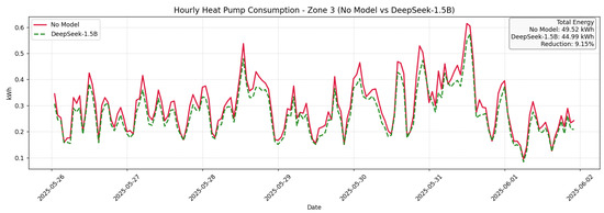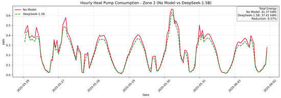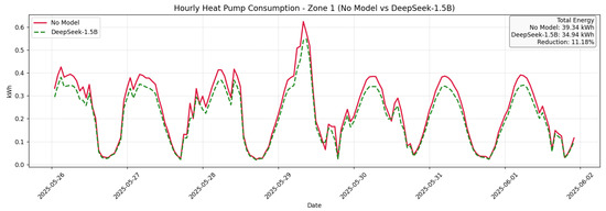 The live evaluation was conducted over a two-week period. From 18 May to 25 May, the building followed default HVAC schedules and manual control by occupants (baseline period with no LLM model applied). From 26 May to 2 June, the LLM engine (DeepSeek-R1-Distill-Qwen-1.5B) was activated, delivering recommendations every 15 min using the same environmental inputs. These dates correspond directly to the x-axis of Figure 7, Figure 8 and Figure 9, marking the transition from the baseline week to the intervention week with LLM control. These suggestions guided occupants or automated systems to adjust temperature, ventilation, and appliance usage based on real-time zone conditions and PV forecasts.