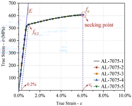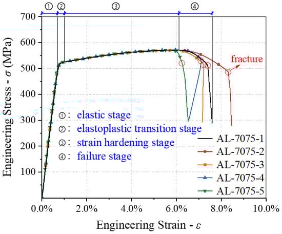 - Room-temperature tensile tests were conducted on 7075-T6 aluminum alloy specimens, obtaining fundamental mechanical properties such as the elastic modulus, nonproportional extension strength, ultimate strength, and fracture stress. These were used to establish an experimental foundation for the proposal and calibration of subsequent constitutive models.