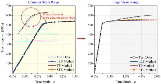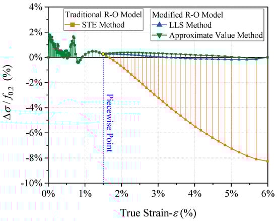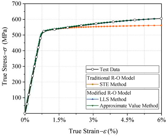 - The parameters of the classical R–O constitutive model were calibrated using the LLS method, the traditional TP method, and the STE method. The results indicated that in the common-strain range of 7075-T6 aluminum alloy (ε < 0.015), the reasonable value for n is 50 to 80.