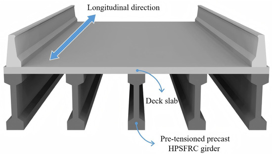 This study focused on a 30.0 m long pre-tensioned precast HPSFRC girder from Sichuan, China, which eliminated conventional reinforcement, relying on HPSFRC and prestressed strands. The HPSFRC used in this study has a compressive strength less than 130 MPa, which is different from UHPFRC. Since the compressive strength is enough for the compression zone of a flexural member, HPSFRC with adequate steel fibers and sufficient strands is able to eliminate the need for reinforcement, as mentioned in [6,7]. In addition, the cost and manufacturing complexity of HPSFRC are lower than those of UHPFRC, allowing for easier implementation of the HPSFRC girder. Considering that few experimental studies have tested real-scale and relatively large-span pre-tensioned precast girders without conventional reinforcement, and HPSFRC has rarely been reported to be applied in similar girders, it is necessary to investigate the full-scale pre-tensioned precast HPSFRC girder to fill this gap. Moreover, a full-scale test is the most direct way to validate the performance and feasibility and instruct standard design.