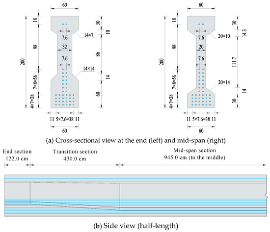 The structural configuration and strand arrangement are depicted in Figure 2. The end-to-end full length and height of the selected I-shaped girder are 29.94 m and 2.0 m, respectively, while the nominal span is 30.0 m. The web thickness is 32 cm for the end section and 20 cm for the mid-span section. The flange width is 60 cm for all sections. According to the side view shown in Figure 2b, there are two 122 cm long end sections, two 430 cm long transition sections, and one 1890 cm long mid-span section along the longitudinal direction of the girder. In the transition section, all dimensions maintain a smooth linear shift along the longitudinal direction. Multiple pre-tensioned steel strands with a nominal diameter of 15.2 mm are positioned at the girder web and lower flanges, with two strands passing through the upper flange. The strands are horizontally straight, which is convenient for positioning, fixing, and pre-tensioning. To ensure smooth concrete flow between the strands, the minimum clear spacing of the strands was limited to 54.8 mm. The controlled pre-tensioned stress level for the strands was 1395.0 MPa. After the strands were pre-tensioned to the designed stress level, HPSFRC was poured in to fabricate the girders, followed by seven-day moisturized curing in natural condition. The pre-tensioned strands were released and cut off after the concrete strength requirements were satisfied.