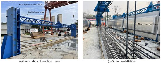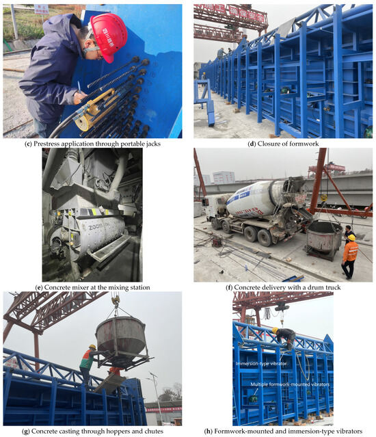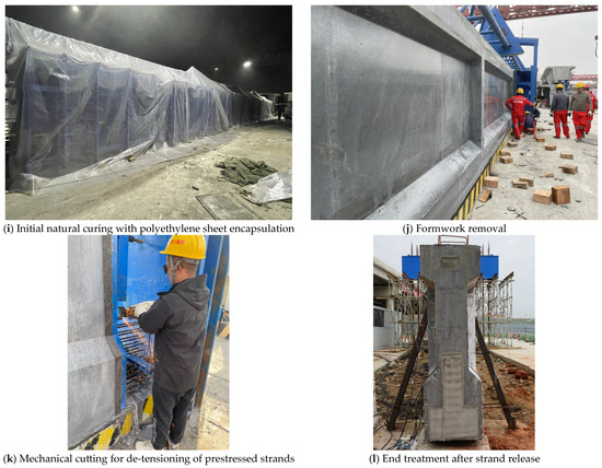 The prefabrication factory was 25 km away from the bridge location. It was one of the major prefabrication factories for the Chengmian Expressway Expansion Project. One temporary production line was established specifically for the HPSFRC girders of Qingjiang Bridge. The production process comprised the following sequential operations: (1) the preparation of the prestressing bed and abutments for pre-tensioning, Figure 3a; (2) the assembly and temporary anchorage of steel strands with sufficient initial stress to offset self-weight effects, Figure 3b; (3) the application of designed prestress to the steel strands using portable hydraulic jacks, Figure 3c; (4) closing and sealing of the stainless steel formwork, Figure 3d; (5) mixing, placement, and vibration of the HPSFRC, Figure 3e–h; (6) initial curing under natural conditions involving cling film coverage or polyethylene sheet encapsulation for a minimum duration of 16 h, Figure 3i; (7) formwork removal, followed by extended natural curing with supplemental water spraying for no less than 7 days, Figure 3j; and (8) the controlled release of steel strands employing symmetrical and staggered sequencing, Figure 3k,l. The specimen girder was stored alongside other HPSFRC girders under factory conditions for an average period of approximately 2.5 months prior to the bending test, which was conducted in advance of bridge construction.