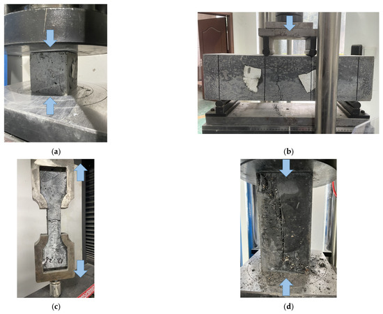 Mechanical tests for HPSFRC. (a) Cubic compression test (specimen size: 100 mm × 100 mm × 100 mm), (b) Flexural tension test (specimen size: 150 mm × 150 mm × 550 mm), (c) Direct tension test (tested section size: 50 mm × 50 mm), (d) Elastic modulus test (specimen size: 150 mm × 150 mm × 300 mm).