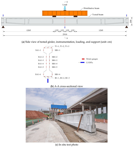 The test setup is shown in Figure 5a. The girder was tested under a pure bending span of 5.0 m, while the length between the centers of two rubber supports was 29.1 m. The load was applied using a hydraulic jack with a load cell, distributed to two points by a stiffened steel beam. From Figure 5a, it can be seen that one LVDT was installed at the middle of the pure bending span to measure the mid-span deflection, while two LVDTs were used to measure the vertical deformation of the rubber supports. As shown in Figure 5b, at the mid-point A-A section, strain gauges were mounted symmetrically on the top, bottom, and two lateral-side surfaces of the girder to monitor the concrete strains along the depth of girder. Continuous data acquisition for the load cell, LVDTs, and strain gauges was performed during all phases of the load protocol. As depicted in Figure 5c, the full-scale girder test was carried out in situ.