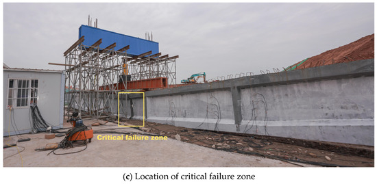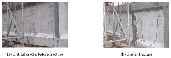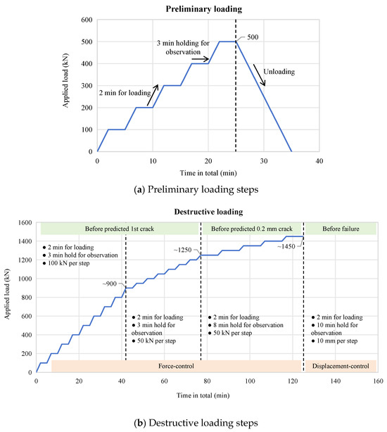 As shown in Figure 6, the loading protocol consisted of preliminary and destructive stepwise loading. The preliminary stepwise loading was force-controlled, and designed to verify the normal operation of the loading equipment and sensors. At each step, the load was applied for 2 min followed by holding for 3 min for observation. Unloading was conducted after reaching the target load of 500 kN, approximately 20% of the predicted peak load. Destructive stepwise loading was initially applied in force control. Before the first crack was observed, load was applied for 2 min followed by holding for 3 min for observation, similarly to the preliminary steps. The loading mode was switched to displacement control upon detection of a 0.2 mm wide crack, which was considered as the serviceability limit in accordance with Chinese national standard GB 50010-2010 (2015) [30] and transport professional standard JTG 3362-2018. The total maximum load at the preliminary stage was 500 kN, with a 100 kN increment for each step. After confirming the instrument’s functionality through preliminary loading, the hydraulic jack was unloaded to its initial position. Then, formal loading was initiated. The initial load increment for each step was 100 kN, which then changed to 50 kN after observation of the first crack. Upon detection of a 0.2 mm wide crack, the loading mode was switched to displacement control and maintained until the occurrence of critical failure, at which point the test was terminated. As stipulated by Chinese national standard GB 50204-2015 [31], a flexural member is considered to have reached critical failure if any of the following criteria are met: (1) the maximum tensile crack width of the concrete reaches 1.5 mm; (2) the mid-span deflection exceeds 1/50 of the span length; (3) concrete crushing failure occurs in the compression zone; or (4) fracture of the primary tensile reinforcement is observed. Throughout the loading process, manual observation and marking of crack development were conducted.