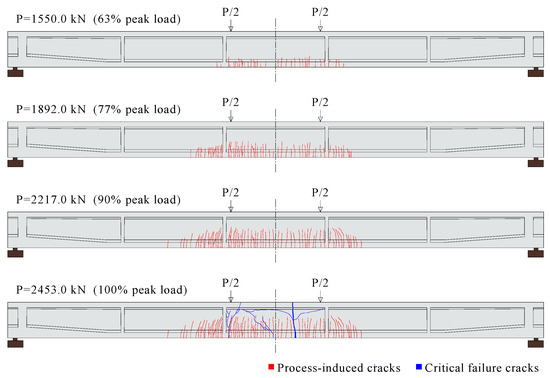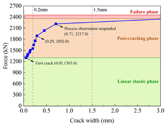 Figure 9 depicts the relationship between the applied load and the maximum crack width within the pure bending span. Crack monitoring was conducted intensively prior to the appearance of 0.2 mm wide cracks. Following the detection of these cracks, the recording frequency was gradually reduced due to safety considerations, and crack propagation observation was entirely suspended upon reaching a load of 2217.0 kN (90% peak load). Post-failure observation was then performed to document the characteristics of critical failure cracks. The plot in Figure 9 shows that the growth rate of the crack width remained nearly constant until the 0.29 mm wide cracks were detected. Due to the final fracture failure, the crack width at the ultimate stage exhibited a dramatic increase, resulting in an abrupt near-plateau segment in the curve. The results indicated that the critical cracks attained a width of 1.5 mm either immediately preceding or during the failure phase, with associated load close to 95% peak load.