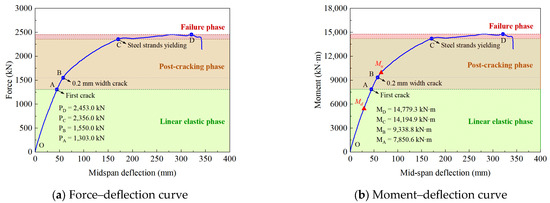 The load–deflection response curves for the tested girder are plotted in Figure 10, including force–deflection and moment–deflection curves. The load represents the total force applied by the hydraulic jack, or the induced normal section moment within the pure bending span, denoted as . The deflection is defined as the mid-point deflection of the tested girder subtracting the measured displacement of the rubber supports. Generally, the load–deflection curves exhibit three distinctive phases of response, namely (1) the linear elastic phase (segment OA), (2) the post-cracking phase (segment AC), and (3) the failure phase (segment CD). The curves indicate deflection-hardening behavior. Owing to the fiber bridging effect, this behavior is characterized by an ascending post-cracking load–deflection response and extensive cracking patterns [32].