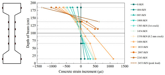 The concrete strain along the girder depth at the mid-point cross-section of the tested girder was continuously measured using the strain gauges shown in Figure 5. The strain distribution along the section depth at different load levels is plotted in Figure 11. The concrete strain represents the mean values of paired readings from strain gauges installed on the lateral-side surfaces. Before concrete cracking, the curves indicate a linear distribution of strain along the girder depth, and the neutral axis is approximately located at the center of the girder height, in agreement with the plane section assumption. The neutral axis of the tested girder remained in place until the first crack appeared. Due to the onset of a 0.2 mm wide crack, there was an obvious upward migration of the neutral axis when the load reached 1604.0 kN, and the strain distribution remained approximately linear before the cracks intersected the strain gauges. The measured strain gradually became nonlinear due to crack progression. When the load was approaching the peak load of 2453.0 kN, cracks extending through the strain gauges induced failure of several strain gauges.
