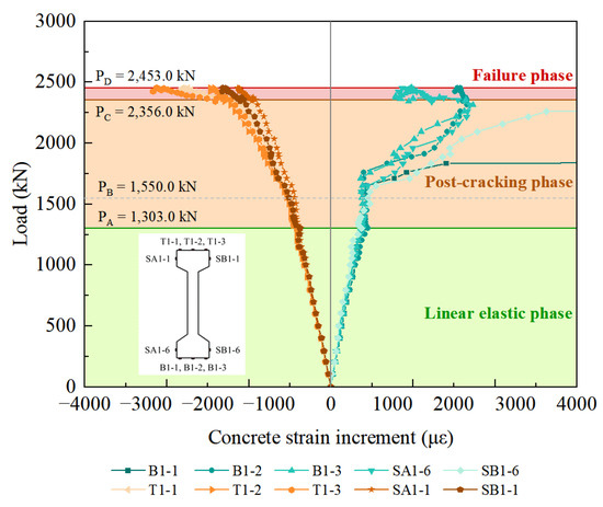 The load–strain relationship of the girder concrete for the top and bottom edges at the mid-point cross-section is shown in Figure 12. Under pure bending, the top edge of the tested girder at the mid-point experienced compression, while the bottom edge was subjected to tensile stress. For the labels in the legend of Figure 12, the letters “T”, “B”, and “S” stand for top, bottom, and side surfaces, respectively. The curves of the bottom edge in tension were linear until the first crack occurred. When micro cracks formed, the curves of the bottom edge fluctuated. After a 0.2 mm wide crack was observed, turning points gradually appeared in the curves. Generally, the corresponding load for the first turning point was larger than that of the load–deflection curve. When the cracks passed through the strain gauges, the measured strain increased drastically with the increase in load, such as in B1-1. When approaching the failure phase, strain gauge SB1-6 was unable to accommodate further excessive deformation at the crack position, inducing a plateau in the curve. However, owing to the strain release of concrete blocks between the cracks, the concrete strain experienced a decrease with increasing load, such as in B1-2, B1-3, and SA1-6. For the top edge in compression, there was a similar linear shape before the first crack. A turning point gradually appeared due to the onset of 0.2 mm wide cracks. Upon the beginning of the failure phase, a second turning point appeared and led to a more extensive slope degradation.