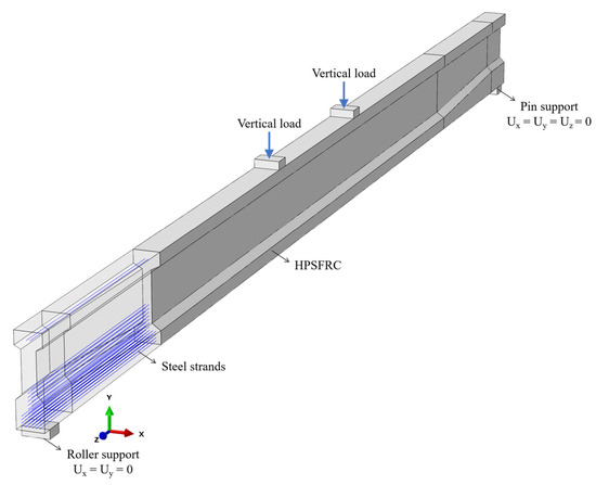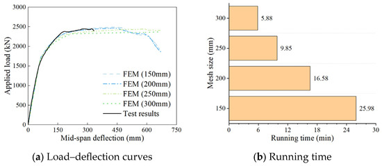 A three-dimensional nonlinear finite element model (FEM) of the 30.0 m full-scale pre-tensioned precast HPSFRC girder was established, as shown in Figure 13. Loading pads and support blocks were utilized to prevent stress concentration at the loading points and supports, coupled with virtual reference nodes to facilitate vertical load application and reaction force output. Solid elements were employed in the FEM to model the HPSFRC, loading pads, and support blocks, while the steel strands were represented by truss elements. Based on the fact that there is no obvious slip between the concrete and the steel strands during the experiment, an “embedded region” interaction command, namely a perfect bond, was adopted between them. For the contact surfaces of other solid element components, “tie” interaction commands were executed. To simulate the prestressing process, a predefined temperature field was utilized to generate temperature load by “cooling down” the steel strands. The boundary condition was set as simply supported, which referred to pin support and roller support on each end, equivalent to the in situ experimental test. As shown in Figure 14, four models with different mesh sizes were established to carry out sensitivity analysis. Since a nominal element size of 200 mm induced results with satisfactory accuracy and a shorter running time than for 150 mm, the nominal element size was set to 200 mm for the 30.0 m full-scale girder and its parametric study.