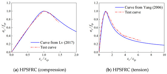 Previous research concerning the constitutive model of SFRC considered the fiber effect, including volume fraction and fiber properties [34,35,36,37]. The models successfully predicted the experimental responses reported in the corresponding studies. However, most studies covered SFRC with relatively lower strengths and lower volume fractions of fiber. Lv et al. [36] conducted an experimental study on high-strength SFRC with volume fractions ranging from 0% to 2.0% and cubic compressive strengths of 60 MPa and 80 MPa. The steel fibers used included hooked-end fibers. The proposed analytical model for compression considered the effects of fiber volume fraction on uniaxial compressive strength, strain corresponding to the peak stress, and the elasticity modulus, and agreed well with the experimental curves. Therefore, the model developed by Lv et al. [36] was adopted to determine the uniaxial compression stress–strain relationship of HPSFRC, the equations of which are provided through Equations (1)–(8). As shown in Figure 15a, the predicted compressive stress–strain curve was in good agreement with the test curve.