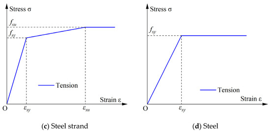 As illustrated in Figure 15c, a bilinear tensile stress–strain relationship model is adopted for the steel strand, the equations of which are provided in Equation (12).