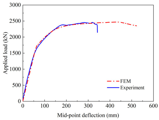 (2) The failure mode, load–deflection relationship, and load–strain relationship simulated by the full-scale FEM were in good agreement with the experimental results. The ultimate bending resistance predicted by the FEM closely matched the experimental outcome (0.8% difference), while the load–deflection curve predicted by the FEM displayed a longer near-plateau segment due to idealized assumptions. Thus, the validated FEM is reliable for predicting flexural behavior.