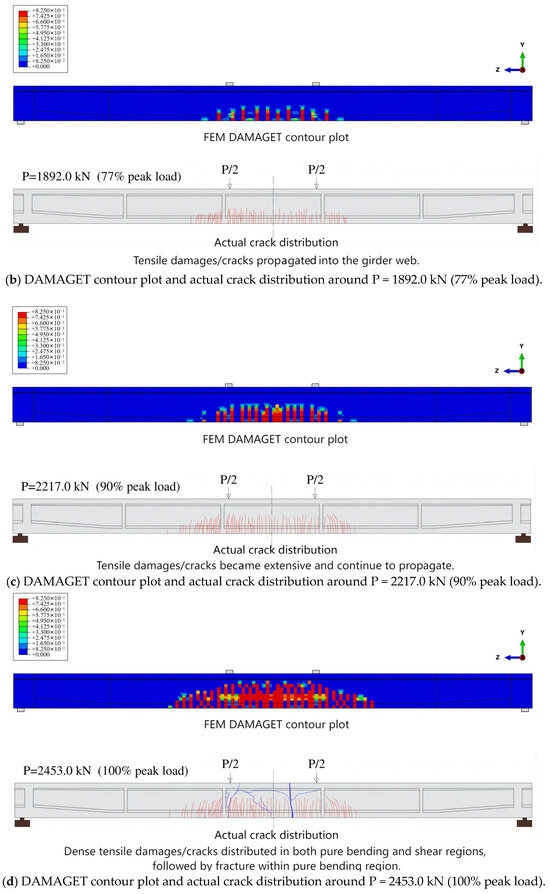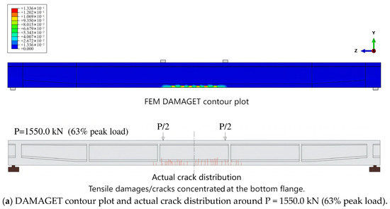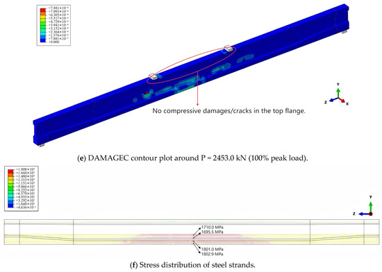 To validate the reliability of the FEM in predicting the overall flexural responses of the pre-tensioned precast HPSFRC girder, the load–deflection relationship obtained from this FEM was compared with the experimental outcomes presented in Section 4.3. As depicted in Figure 16, the reasonable consistency between the FEM predictions and experimental observations during the entire loading process supports the capability of this FEM when predicting the overall bending behavior. Notably, the FEM predicts a marginally higher (0.8%) load capacity (2473.4 kN) with larger corresponding deflection (437 mm) compared to the experimental results, which can be attributed to the idealized assumption for the steel strand constitutive model and perfect bond assumption between steel strands and HPSFRC. Figure 17 demonstrates the failure mode predicted by this FEM. The tensile and compressive damage patterns are monitored by DAMAGET and DAMAGEC values, respectively. The progressive tensile damage pattern shown in Figure 17a–d is in reasonable agreement with the actual crack development in Figure 7. The compressive damage pattern shown in Figure 17e indicates that no concrete crushing occurs at the top flange. Figure 17f demonstrates that all the steel strands in tension almost reach the ultimate strength condition upon peak load, which is in adequate agreement with the fracture failure observations in Section 4.1.