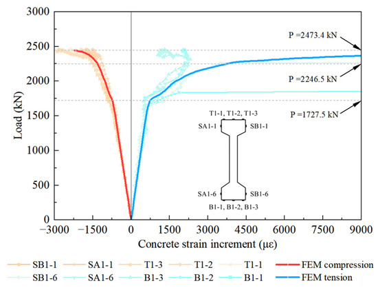 The predicted tensile strain of the bottom surface and compressive strain of the top surface at the mid-point of the girder are compared with the experimental outcomes, as shown in Figure 18. For both the tensile and compressive conditions, the load–strain curves predicted by the FEM exhibit two distinct turning points, P = 1727.5 kN and 2240.3 kN, which adequately correspond to the experimental curves. Before the occurrence of the first turning point, the stiffness presented by the FEM curves matches that of the experimental curves well. Upon excessive yielding of the steel strands, the second turning point appeared for both the tensile and compressive FEM curves.