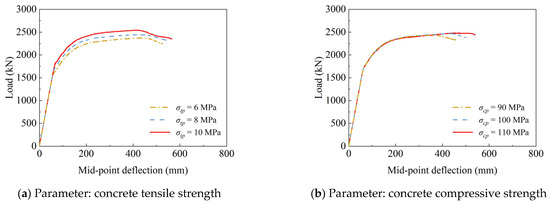 Three values of concrete tensile strength (6 MPa, 8 MPa, and 10 MPa) were selected without changing any of the other parameters. The corresponding load–deflection curves are plotted in Figure 19a. The figure indicates that enhancing the concrete tensile strength is beneficial to postponing the turning points and slightly enhancing the girder stiffness in the nonlinear post-cracking phase. The bending resistance is also improved, while there is no significant influence on girder ductility. As discussed in Section 5.2, several factors are closely related to the tensile strength of HPSFRC, namely the concrete matrix strength, fiber volume fraction, fiber geometries, and fabrication quality. To guarantee the post-cracking behavior of the girder, more attention should be paid to the quality control of raw materials and the mixing, pouring, and curing of HPSFRC in real-world construction contexts.