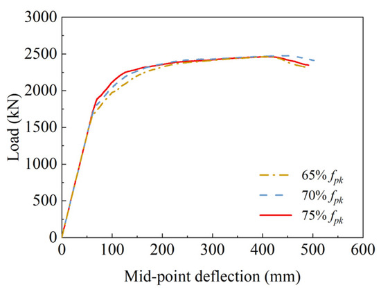 While maintaining the diameter, layout, and configuration of steel strands, the prestress was adjusted to three different levels, represented by varying proportions (relative to the standard ultimate strength of 1860 MPa). As depicted in Figure 20, although the prestress level of steel strands has no obvious effect on the load capacity, an elevated prestress level can suppress crack initiation and enhance post-crack stiffness, owing to a more sufficient reserve of compressive stress at the bottom edge of the girder. Additionally, the yielding of the steel strand is also accelerated when increasing the prestress of the steel strand, leading to an earlier occurrence of a plateau-like segment in the curve.