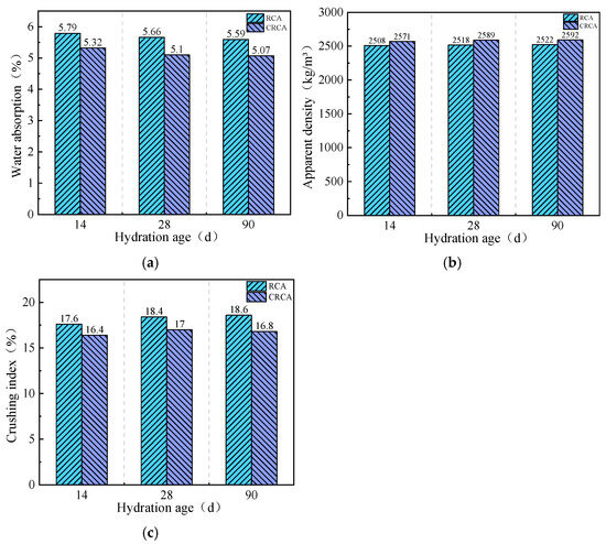 CRCA physical properties. (a) Water absorption; (b) apparent density; (c) crushing index.