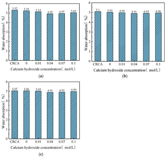 Water absorption of W-RCA. (a) Recycled aggregates at 14 days of age; (b) 28 days of age; (c) 90 days of age.