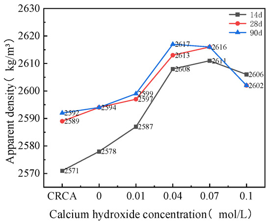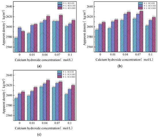 W-L-RCA apparent density. (a) Recycled aggregates at 14 days of age; (b) 28 days of age; (c) 90 days of age.