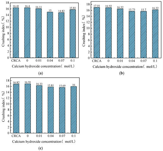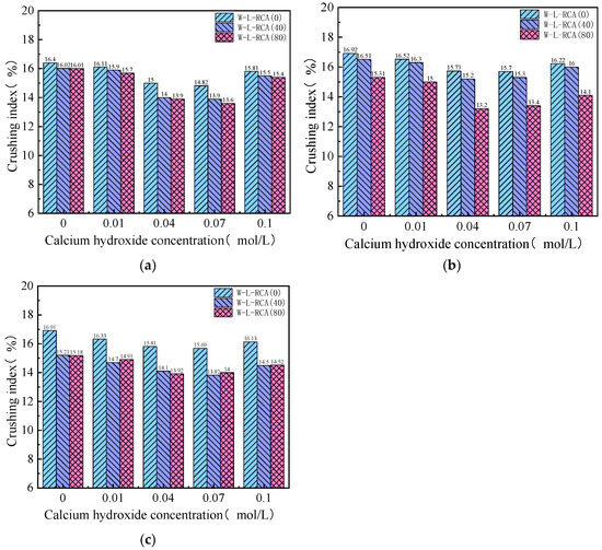 W-RCA crushing indicator. (a) Recycled aggregates at 14 days of age; (b) 28 days of age; (c) 90 days of age.
