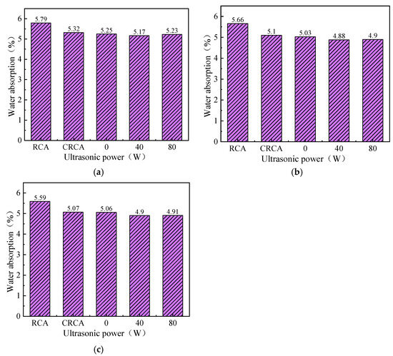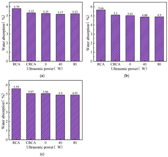 The water absorption of recycled aggregate carbonized by ultrasonic cavitation decreased to 14d, 28d, and 90d, as illustrated in Figure 5. The absorption of recycled aggregate water decreased by 9.84% to 10.71% (relative to uncarbonized) and 2.82% (relative to direct carbonization) in 14.d, 11.13% to 13.78% and 4.31% in 28d, and 9.48% to 12.34% and 3.35% in 90d. A decreasing overall trend was observed, with the degree of decrease for 28d and 90d being greater than that of 14d. The reduction of water absorption after carbonization was most pronounced at 40 W ultrasonic cavitation power, and the effect of ultrasonic cavitation treatment became more pronounced as the age of the material increased.