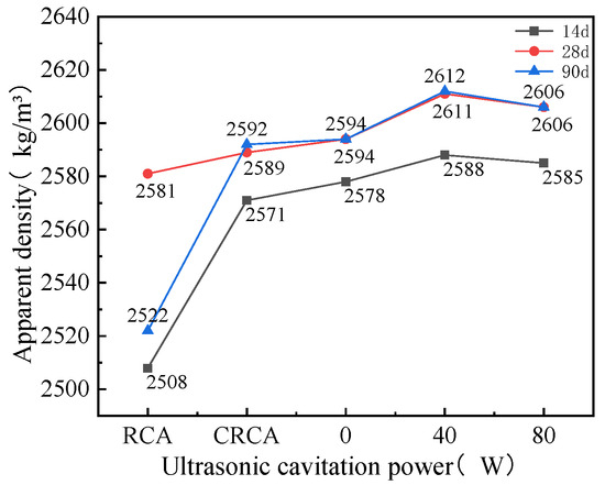 The apparent density of the recycled aggregates carbonized by ultrasonic cavitation with calcium hydroxide pre-soaking pretreatment was enhanced, as illustrated in Figure 9, in accordance with the trend of increased water absorption. The apparent density of the recycled aggregates was improved by approximately 0.5%, 0.57%, and 0.50% at the ages of 14d, 28d, and 90d, respectively. Although the improvement is not substantial, it still suggests that the combined pretreatment technique has the potential to enhance the physical properties of recycled aggregates to a certain extent, thereby demonstrating the possibility of optimizing the overall performance.