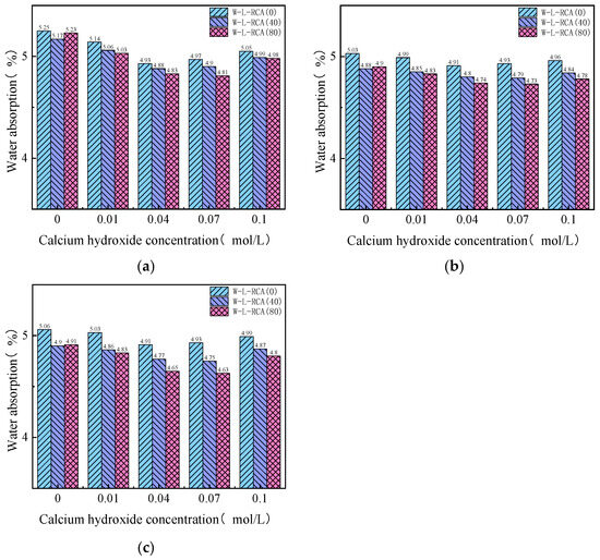 Water absorption of W-L-RCA. (a) Recycled at 14 days of age; (b) 28 days of age; (c) 90 days of age.