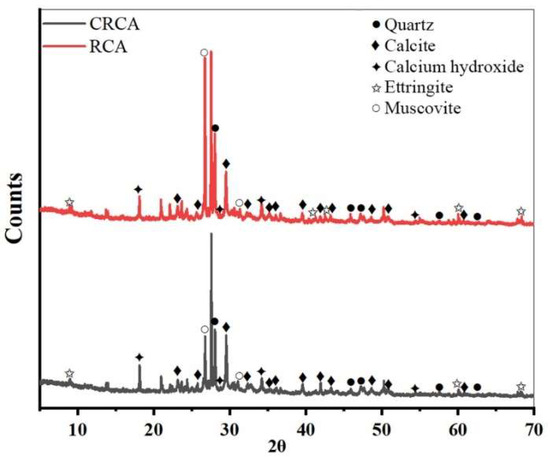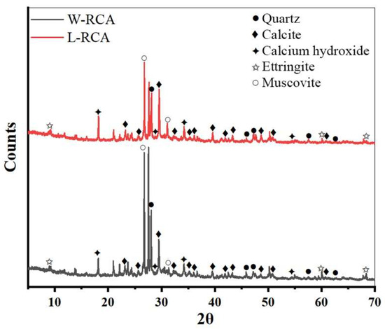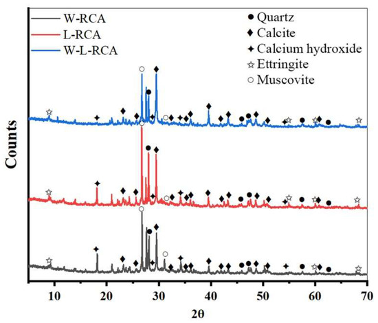 To analyze the XRD diffraction patterns of the slurry attached to the surface of the recycled aggregate following carbonization treatment of RCA, CRCA, L-RCA, W-RCA, and W-L-RCA, tests were conducted.