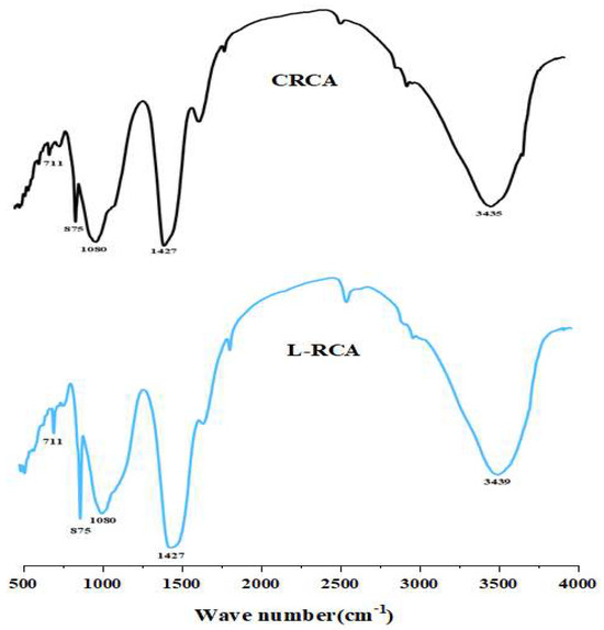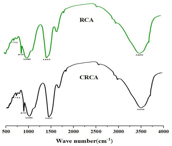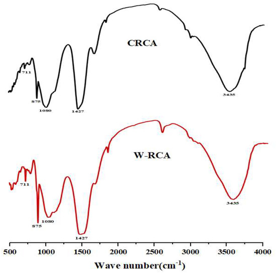 The IR spectra of RCA (recycled aggregate) and CRCA (CO2-treated recycled aggregate) were compared, as illustrated in Figure 14. We discovered that the absorption peaks of CO2-treated samples are accentuated at 1433 cm−1 and 1084 cm−1, and they are attenuated at 3435 cm−1. The positive triangular structure vibration of carbonate is observed in the interval of 1410 cm−1~1510 cm−1 of the infrared spectrum during carbonation, as the C=O bond of carbon dioxide is converted to C-O bond vibration. This reaction between carbon dioxide and calcium hydroxide in the recycled aggregate results in the formation of calcite. The increase in peak area at 1080 cm−1 of the CO2-treated samples still suggests silica production, despite the fact that the Si-O-Si bonds in quartz sand interfere when analyzing the Si-O bonds in recycled aggregate.