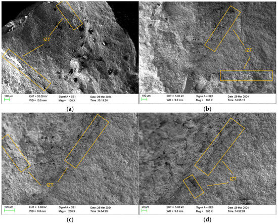 SEM photograph of the transition zone at the recycled aggregate interface. (a) CRCA; (b) W-RCA carbonized; (c) L-RCA carbonized; (d) W-L-RCA carbonized.