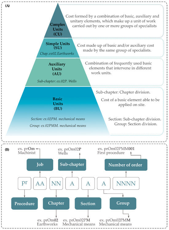 All costs are expressed as a unit of measurement with a measurement criterion, adjusted to the uses and tendencies of execution. The concepts described above together constitute the epigraph of a unit cost, resulting in all costs having an epigraph, which is different for each element of the system. The work units are organised in an ascending structure of sections, groups, subchapters, and chapters (Figure 2A).