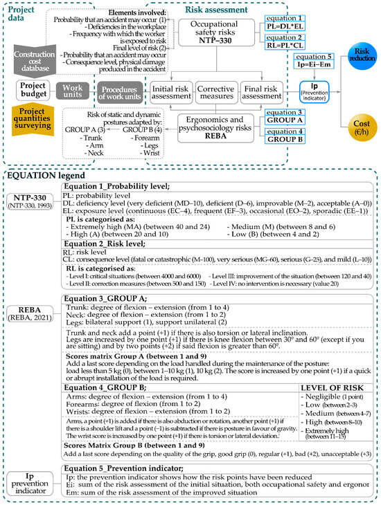 For a better understanding, in addition to a detailed summary of equations and calculation methodology presented in Figure 3, each stage of the methodology is developed through an example: (1) project data, (2) procedures of work units, (3) risk assessment and (4) prevention indicator (Ip): risk reduction and cost (EUR).