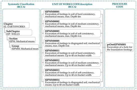 The classification of the ACCD (see Figure 2A) can be employed for an AI-driven methodology. The codes’ numbers and letters can be employed for the definition of the construction tasks and the risk evaluation, as shown in Figure 2B. A tree has been added to show a possible expansion of the present work (see Figure 4). Some work units of the ACCD are used to illustrate how the same procedure could be associated with others, specifically, procedure PrOm02PMM001. The excavation of a hole for the foundation footings can be associated with the units listed in Figure 4, since these are excavations in which only the type or consistency of the soil varies. Once the database is completed, artificial intelligence can be applied to identify patterns, as in [47], or predictive models in time series can be used, as in [48].