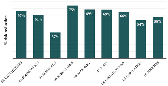 The risk level of the project is reduced by 65%. The structures chapter stands out with the greatest reduction of 75%, followed by the masonry and roof chapters, with 69% each (see Figure 5). Since these are the chapters that present a considerable risk of falling from a height, the protection and preventative measures achieve a substantial reduction. These major risks coincide with those found in Spain by Camino-Lopez [55], where scaffolding, ladders, and cranes—elements used in the construction of structures, masonry, and roofs— caused most accidents.