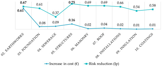 At the level of unit costs, the greatest risk reduction is 80%, in 05FUA00005, corresponding to the incorporation of a concrete slab with self-resistant beams. This work unit has four procedures, of which the following stand out: PrAl05FUA002, which affects the mason during the placement of the beams and vaults; and prFe05FUA003, which affects the rebar placer during the placement of the concrete reinforcements, both with a risk reduction of 83% (Figure 6). This quantitative analysis enables the level of risk of the project to be related to the investment made to reduce the risk (Figure 7). It can be observed that in Chapter 02 Earthworks, the values of investment and risk reduction are very close in the graph (Figure 7). Since the measures adopted have not entailed a high cost, nor have a high-risk reduction, the chapter also has a low risk level. In the case of Chapter 05 Structures, there is a high initial risk level due to the possibility of falling from a height. In this case, we can observe how the investment in protection measures is the highest of all chapters, but it also has a significant risk reduction achieved (Figure 7).