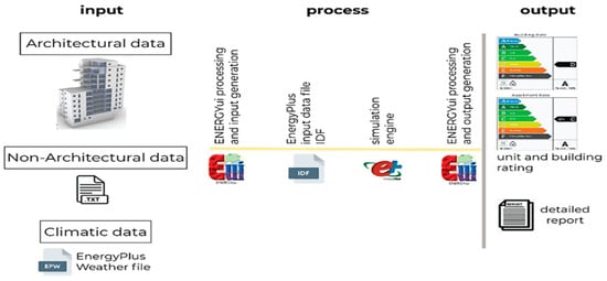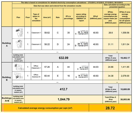 The EPdes value per square meter is calculated for each space using relevant data from the SI 5282 tables and simulation reports (Equation (1)), and then the overall average EPdes is determined through a weighted average (Equation (2)), which involves multiplying each space’s area by its EPdes value, summing these products, and dividing by the total area of all spaces included in the simulation.
