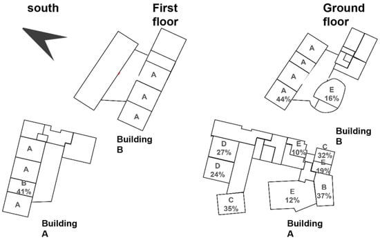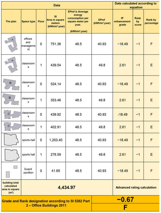 Secondly, a rating-based evaluation methodology was used to compare the initial energy consumption value determined during planning stages with a value obtained based on actual electricity consumption, as per the criteria of Israeli energy rating standard SI 528, calculating the average rating of all floors, taking into account their relative areas (Equation (3)):