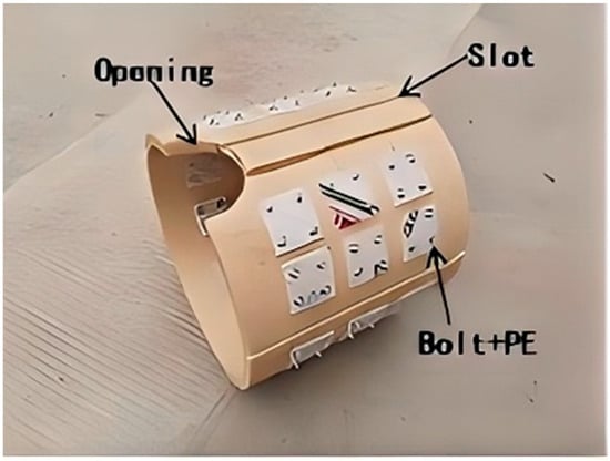 The model test tunnel was designed based on a preliminary shield tunnel configuration featuring a 6 m diameter and an 8 m overburden. The jacking pipe model has a diameter of 1.4 m, a wall thickness of 20 cm, and a segment length of 1.0 m. Both the model shield segment (Figure 1) and the jacking pipe were fabricated from nylon material. Shield ring joints were simulated using bolts and polyethylene (PE), while longitudinal joints were modeled via the lateral slot method, consistent with references [,,]. Applying similarity principles, primary test parameters were established, encompassing prototype tunnel characteristics and model geometric and physical indicators (Table 1). Segment joint parameters were derived from the literature [,,], with joint dimensions determined using the equivalent stiffness coefficient similarity ratio.