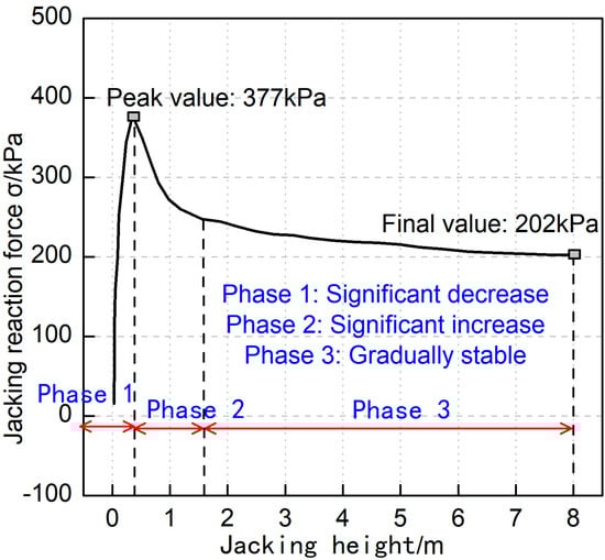 As illustrated in Figure 3, the vertical jacking reaction force demonstrates pronounced nonlinear characteristics throughout its development. This force evolution can be delineated into three distinct phases: an initial increase, a subsequent decrease, and eventual gradual stabilization. During the initial phase, as the jacking height attains 0.4 m (h/20), the reaction force experiences a significant increase. At this stage, the overlying soil layer becomes subjected to compression, culminating in a maximum pressure of 377 kPa at the diffusion block. The subsequent phase, corresponding to jacking heights ranging from 0.4 m to 1.6 m (h/20 to h/5), is characterized by shear failure within the overlying soil, resulting in the formation of a sliding surface and a consequent rapid decrease in reaction force. Thereafter, as jacking height increases further, the reaction force continues to diminish at a reduced rate, ultimately stabilizing at approximately 202 kPa.