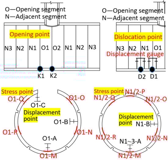 The monitoring system integrates displacement monitoring points embedded within the soil layer, strain gauges affixed to the shield tunnel lining, displacement transducers, and jack force sensors. Displacement monitoring points were interconnected using plastic sheets and thin wooden strips. High-definition digital cameras and camcorders recorded displacement monitoring point variations at five-second intervals throughout the jacking process. Strain gauges and displacement transducers collected data on shield tunnel lining stress and deformation during jacking, with particular emphasis on the opening ring deformation. Monitoring points were primarily positioned on the opening ring O1 and the adjacent rings N1 to N3.