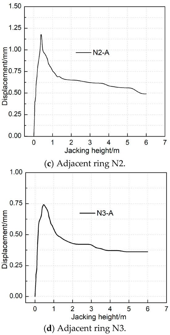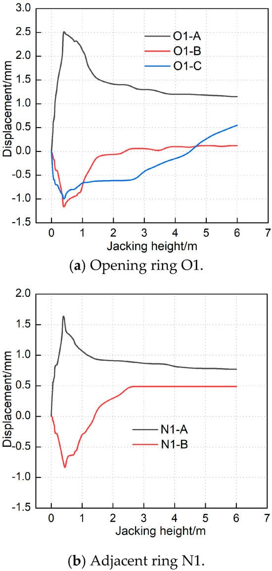 Under vertical jacking force influence, the opening ring (O1) and adjacent segments (N1 to N3) primarily exhibit vertical deformation responses. Recorded maximum settlements at the base measure 2.55 mm, 1.68 mm, 1.20 mm, and 0.75 mm, respectively. The opening ring experiences notably greater deformation than adjacent rings, with N3 displacement measuring only 44.6% of N1 displacement, indicating a more than twofold difference. This observation indicates that the jacking force influence zone encompasses the opening ring and its two adjacent rings. Additionally, the opening ring’s maximum horizontal displacement is 1.18 mm, substantially less than its vertical displacement. Consequently, segment vertical displacement characteristics warrant primary consideration when designing reinforcement strategies during jacking operations, with particular emphasis on vertical reinforcement measures.