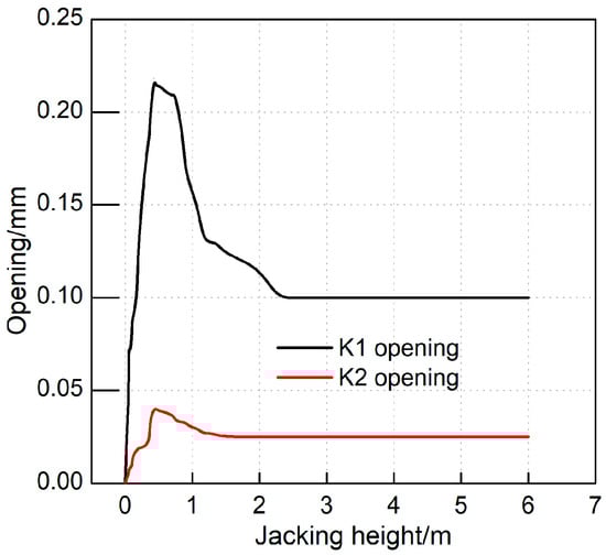 Based on the findings depicted in Figure 5, the longitudinal settlement of the shield tunnel under the most unfavorable jacking conditions (presented in Figure 7) was examined. The tunnel structure was represented by a longitudinally discontinuous beam model. The imposition of jacking reaction forces generates longitudinal bending deformation, leading to maximum joint opening within opening ring pairs. Simultaneously, abrupt longitudinal load transitions induce segment dislocation, causing maximum displacement between the opening ring and its adjacent ring. Consequently, the assessment of segment joint deformation concentrated on measurements obtained from the bottom joint K1 (located within opening ring pairs) and bottom joint K2 (situated between the opening ring and an adjacent ring).