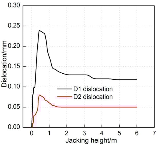 Increasing the jacking height elevates the jacking reaction force, accentuating the load differential between the opening ring and the adjacent ring. Annular joints D1 and D2 exhibited rapid dislocation increases followed by significant decreases upon load reduction. Ultimately, dislocation values gradually diminished and stabilized. Maximum dislocations occurred at peak jacking reaction force: 0.24 mm at D1 and 0.08 mm at D2, representing approximately 33% of D1’s dislocation. This behavior mirrors the opening response, demonstrating notable longitudinal influence attenuation. The limited influence range contributes minimally to tunnel displacement. Longitudinal opening test results confirm that segment openings remain below the joint bolt’s elastic limit deformation value of 1.11 mm []. This measurement is substantially lower than the 2 mm control value for subway ring seam openings [], while segment dislocations are markedly below the 3 mm control threshold []. Additionally, these test results corroborate longitudinal opening and dislocation assessments derived from lateral displacement measurements.