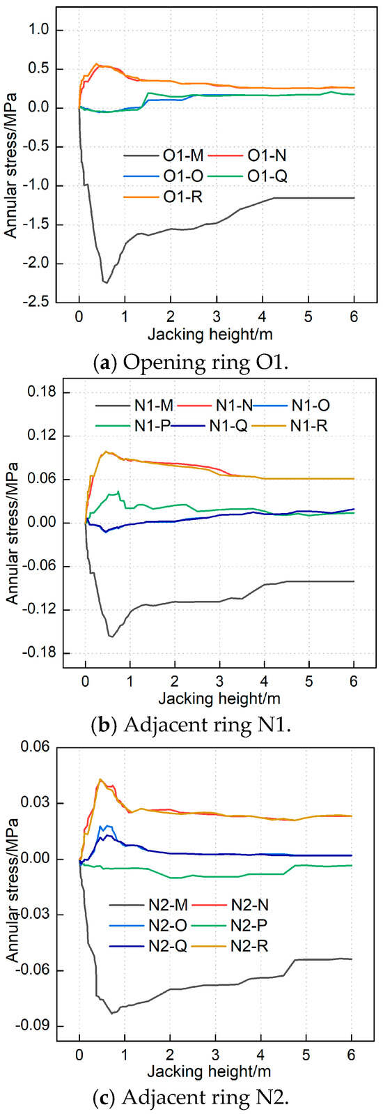 To investigate the potential for damage to the shield segment during the vertical jacking process, 23 stress measurement points were symmetrically positioned within the opening ring and on the inner side of the two adjacent rings. Figure 10 illustrates the stress variations experienced by the segments at distinct construction stages, where positive values denote tensile stress and negative values indicate compressive stress. Throughout the vertical jacking process, both the opening ring and the adjacent ring demonstrated comparable circumferential stress distribution patterns. This similarity indicates that the vault region is subjected to tensile forces while the inner bottom side experiences compressive forces due to jacking. Notably, the compressive stress exhibited an initial increase followed by a subsequent decrease.