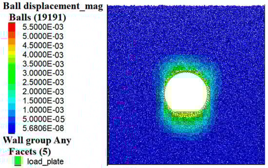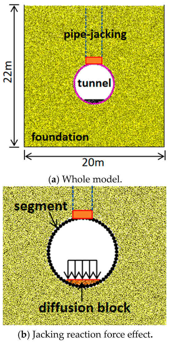 Bonded particle assemblies are employed to model the segment, with circular particle units generated at the segment location. The segment exhibits a thickness of 0.3 m, with a corresponding particle diameter of 0.3 m. The elastic modulus is 34.5 GPa and the Poisson’s ratio is 0.2. A rigid wall element represents the thrust pad, which sustains the jacking reaction force. Additional particles are generated at the base of the diffusion block to accurately represent the actual thickness of the reinforced concrete structure.