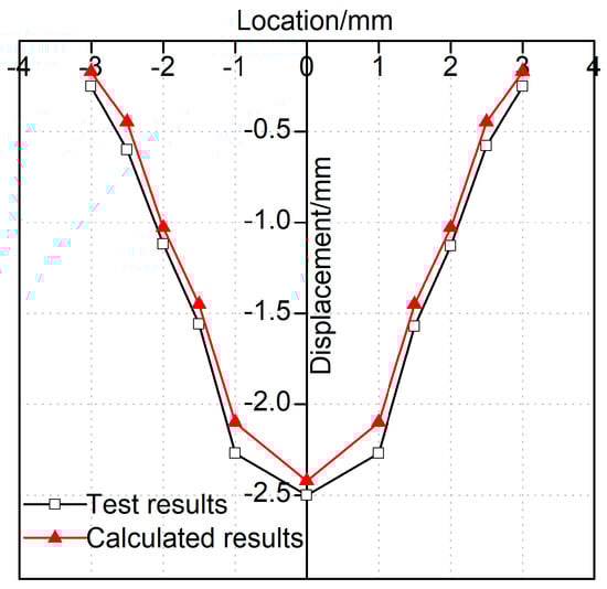 To validate the computational model, the incremental displacement measured at the tunnel invert during the model test is compared with numerical calculation results, as presented in Figure 11. The data in Figure 11 demonstrate that the computational results effectively capture the deformation characteristics of the segment structure, exhibiting strong agreement with experimental measurements. The average displacement discrepancy is on the order of 10%, indicating the robustness of the three-dimensional computational model and the reliability of the model test outcomes.