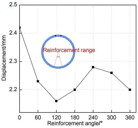 Figure 12 depicts the maximum segment displacement corresponding to varying reinforcement ranges. The minimal segment displacement, approximately 2.16 mm, occurred with 120° foundation reinforcement. This value closely aligns with the maximum opening displacement of 2.23 mm observed under 60° reinforcement. These findings demonstrate that segment-external grouting reinforcement enhances the soil layer’s capacity to constrain segment deformation, thereby inhibiting the progression of segment displacement and joint dilation. Notably, effective reinforcement beneath the segment was achieved within a significantly narrower 60° range, contrasting with the 120° to 360° range suggested in prior studies. Consequently, meticulous monitoring of grouting reinforcement—specifically regulating grouting pressure to prevent localized segment flotation within allowable tolerances—is critical in practical engineering applications.
